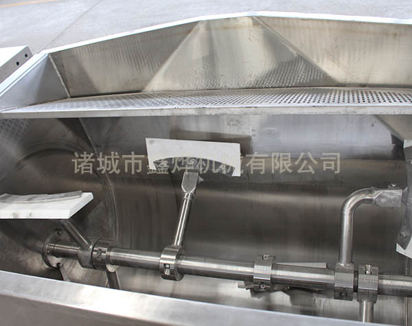 本機的U形鍋頂部抽真空,夾套采用蒸汽加熱,無段變速與蝸輪,減速機的組合傳動,增大了橫軸攪拌的力矩